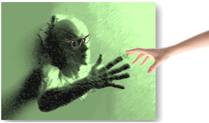 I desperately tried to touch his hand, which I could plainly see glowing in the darkness.